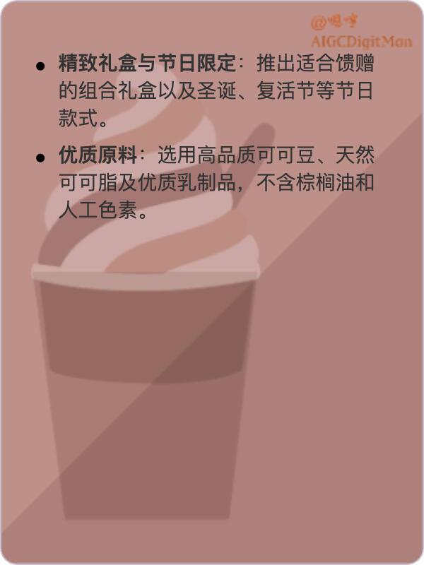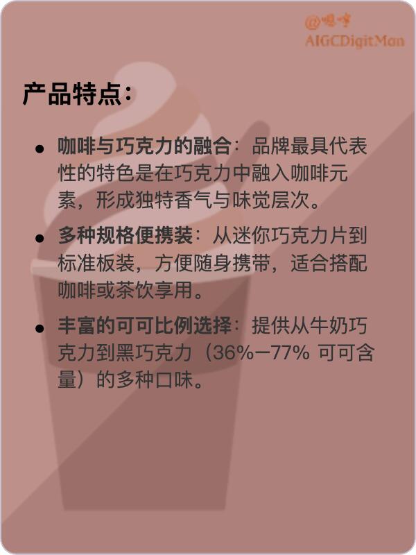 咖啡与巧克力的融合:品牌最具代表性的特色是在巧克力中融入咖啡元素,形成独特香气与味觉层次。
