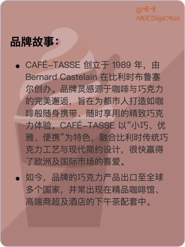 CAFÉ-TASSE 以“小巧、优雅、便携”为特色,融合比利时传统巧克力工艺与现代简约设计,很快赢得了欧洲及国际市场的喜爱。