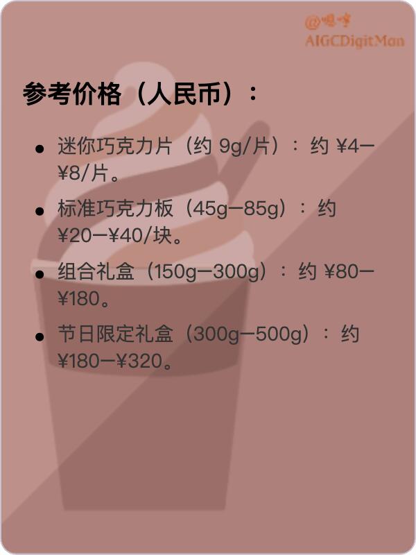 迷你巧克力片(约 9g/片):约 ¥4–¥8/片。