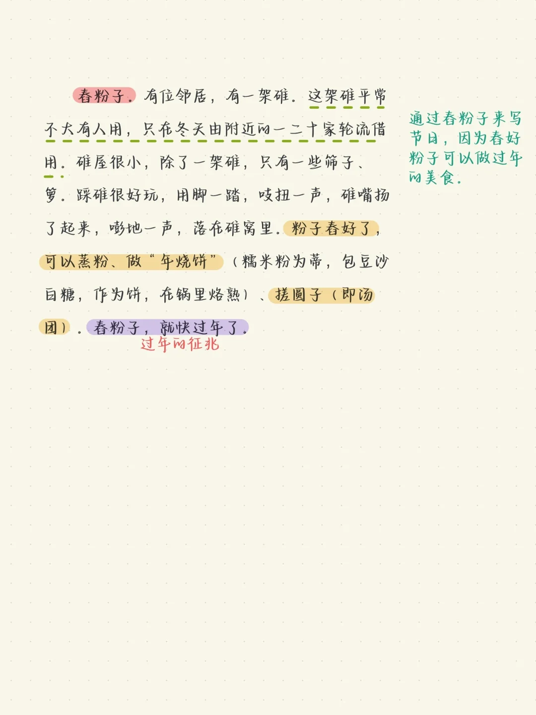 ✅冬天的节日:略写,通过舂粉子的活动,“舂粉子,就快过年了”——呼应冬天的主题,结束全文
