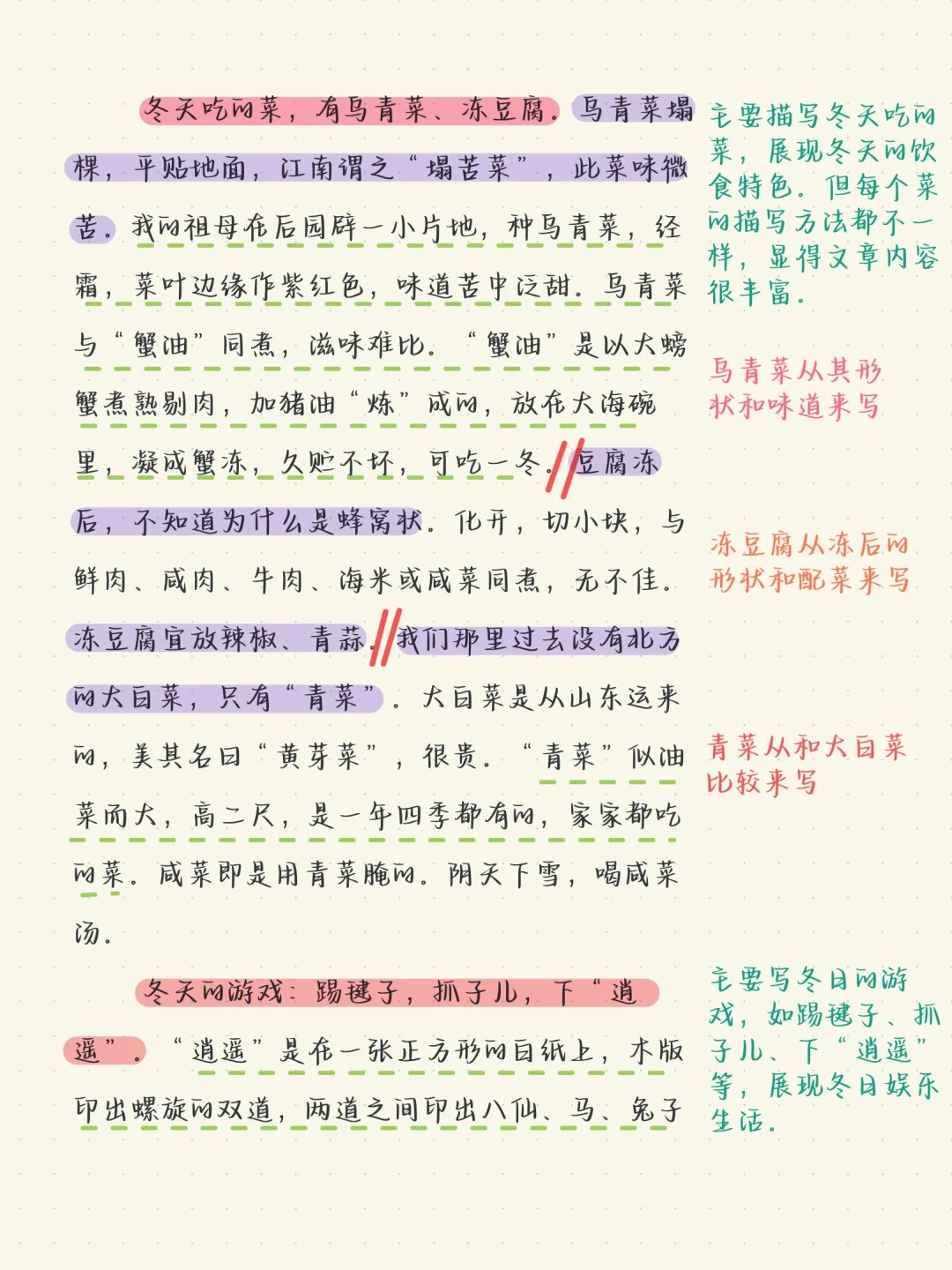 🍂文章从冬天日常生活的冷、吃的菜、玩的游戏到冬天的花、节日,层层深入,来展现冬天。