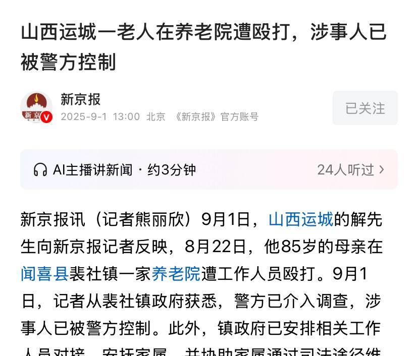 “必须严惩!”山西运城,男子忙于工作家庭,无暇照顾85岁患有老年痴呆的老母亲,遂将老母亲送到养老院。起初本想着老母亲在养老院有吃有喝有人照顾,能够安享晚年,万万没想到,却接到老母亲偷偷打来的电话,称自己被打了!男子懵了,连忙跑到养老院,看到母亲满脸淤青后,心疼不已!随后质问养老院院长母亲未果后,便又报了警,报警后看到监控的那一刻,顿时气不打一处来! 据悉,解先生的老母亲已经85岁,患有轻微的阿尔茨海默症,即我们常说的老年痴呆。 又因为解先生平时忙于工作家庭分身乏术,无暇照顾老母亲,解先生于是花钱将老母亲送到一养老院养老。 解先生本想着老母亲在养老院有吃有喝还有专人照顾,能够安享晚年,万万没想到,却发生了一件令其气愤的事情。 原来,不久前的一天上午,解先生向养老院的院长询问其老母亲的状况。养老院院长给其发了一条其老母亲腰部以下的视频,说一切都很好。 怎料,下午其就接到其老母亲偷偷打来的电话,称自己被养老院院长的母亲打了! 解先生起初接到老母亲电话时,还以为是老母亲又犯病了,不过随后为了以防万一,还是跑到养老院查看情况。 随后,解先生赶到养老院,看到满脸淤青的老母亲后,才确定老母亲真的被人打了! 解先生既心疼母亲,又气愤!连忙将老母亲送医治疗,看到诊断结果显示,老母亲不仅肋骨骨折、胸腔积液,还有头部浅表损伤、头皮血肿、面部损伤,腰椎和胸椎也都压缩性骨折了,更加气愤,便又跑回养老院,向养老院院长的母亲讨说法。 哪成想,养老院院长的母亲不仅不认账,还将责任推给其母亲,称是其母亲自己摔倒磕伤的。 解先生为了给自己的老母亲讨个公道,于是便报了警。 而直到警方调取了养老院的监控,养老院院长的母亲才承认打了解先生的老母亲。 监控显示,事发当天凌晨3点到5点,养老院院长的母亲拿着鞋子多次往解先生老母亲脸上打,还一脚一脚地踹,甚至抓住老人的头发往墙上撞。 据悉,目前警方已经将养老院院长的母亲控制,解先生的老母亲仍在医院接受治疗。 解先生表示,自己的老母亲状态不好,总说怕有人打她,目前正在等待伤情鉴定结果。 老吾老以及人之老!幼吾幼以及人之幼!尊老爱幼是我国的传统美德,更是被写进《老年人权益保障法》等法律之中! 不仅如此! 受人之托忠人之事!养老院既然收了解先生的钱,更应当善待解先生的老母亲。 养老院院长的母亲作为养老院的工作人员,在养老院内殴打解先生的老母亲,很显然属于失职,需要承担相应的违约责任。 同时,根据《民法典》第1002、1004条的规定,自然人享有生命、健康权,任何组织或者个人不得侵害。 还应当注意的是,发生这样的事情,不是赔钱就能了事! 养老院院长的母亲作为打人者,且殴打的是一名85岁老人,至少要被拘留10日并罚款500元。 而应当注意的是,如果经鉴定解先生老母亲的伤情达到轻伤以上的程度,或者说,经调查养老院院长的母亲存在长期殴打老人的情况,养老院院长的母亲还会被追究刑事责任! 等待养老院院长母亲的不止是赔偿,还有法律的严惩! 本案也再次提醒大家,像解先生这样没有办法将父母送到养老院无可厚非,但是一定要牢记,防人之心不可无!时常去看看老人的状况! 这事您怎么看?欢迎在评论区留言,与大家一起交流您的看法! ------ 关注@安律说法 案例中看人生百态,法律中寻破局之法!