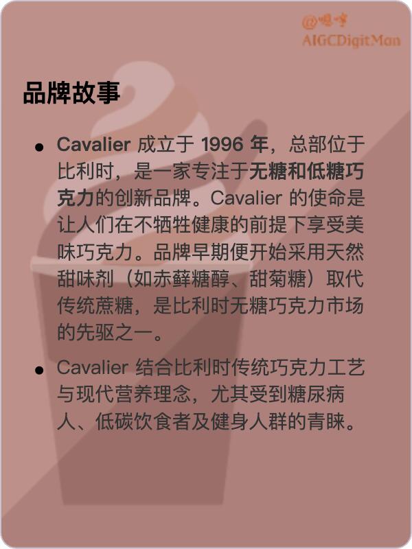 Cavalier 结合比利时传统巧克力工艺与现代营养理念,尤其受到糖尿病人、低碳饮食者及健身人群的青睐。