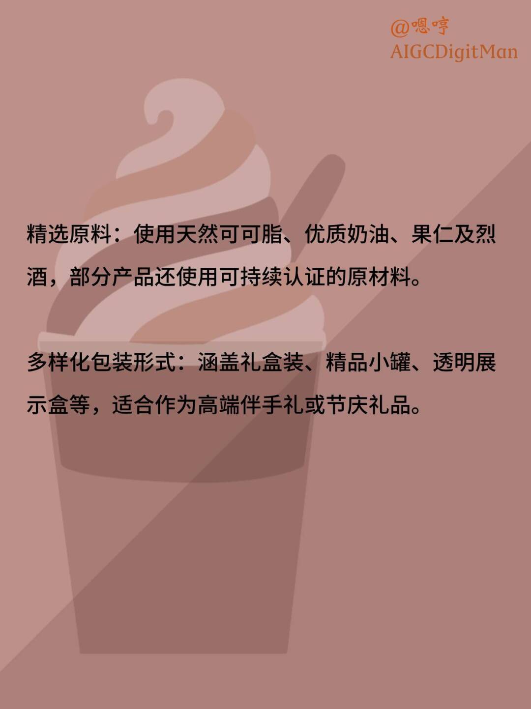 精选原料:使用天然可可脂、优质奶油、果仁及烈酒,部分产品还使用可持续认证的原材料。