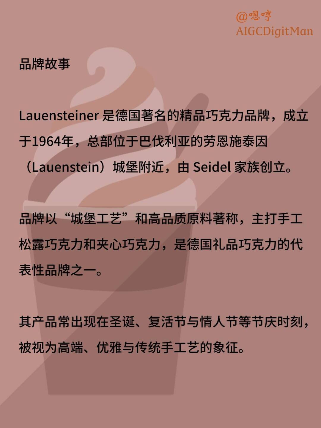 Lauensteiner 是德国著名的精品巧克力品牌,成立于1964年,总部位于巴伐利亚的劳恩施泰因(Lauenstein)城堡附近,由 Seidel 家族创立。