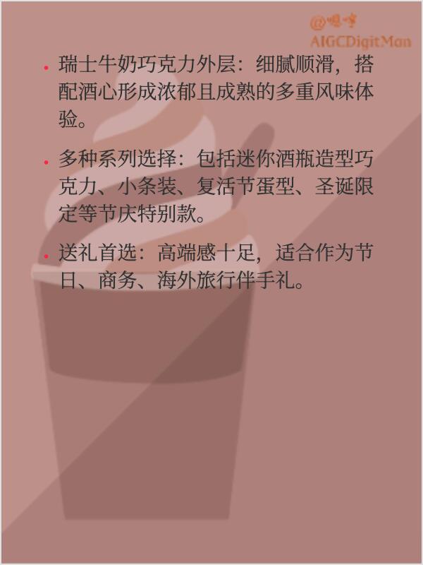 瑞士牛奶巧克力外层:细腻顺滑,搭配酒心形成浓郁且成熟的多重风味体验。