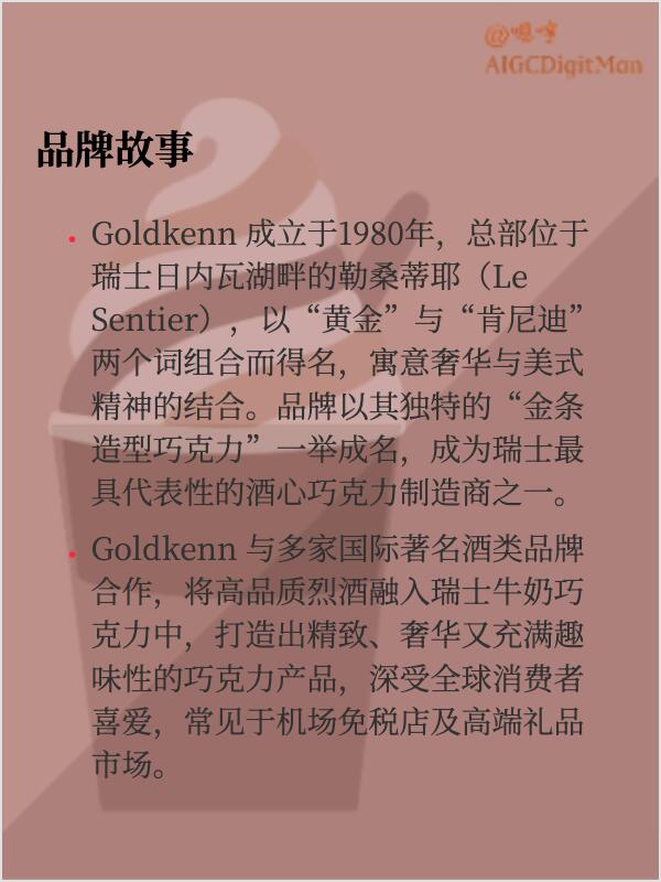 Goldkenn 与多家国际著名酒类品牌合作,将高品质烈酒融入瑞士牛奶巧克力中,打造出精致、奢华又充满趣味性的巧克力产品,深受全球消费者喜爱,常见于机场免税店及高端礼品市场。