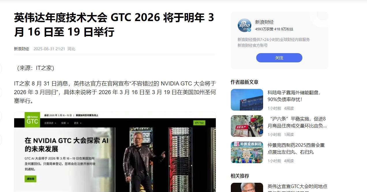 9月2日,英伟达官方宣布,将于2026年3月16日至19日在美国圣何塞举行下一届GTC大会。 说起这场大会的魅力,简直就像科技界的春晚,从2009年第一次举办以来,英伟达硬是把一个小众的技术研讨会,变成了全球人工智能产业的超级盛宴。 每年黄仁勋的主题演讲,都像点燃了一把火,吸引着开发者、工程师、创业者还有投资人的目光。 2026年估计也不会例外,可能会带来更多关于人工智能、机器人、自动驾驶甚至量子计算的突破性进展。 去年大会上,英伟达展示了全新架构、机器人合作项目,还有人工智能从数据中心走向现实世界的趋势。 2026年,我们完全有理由期待更震撼的东西,比如下一代芯片的细节,或者人工智能在医疗、制造、能源这些领域的全新玩法。 这场大会的魅力,不只是秀技术,更是告诉大家:人工智能正在重新定义我们的生活。 会议中心和体育馆将成为全球科技爱好者的朝圣地,开发者在这儿交流代码,创业者谈合作,黄仁勋的演讲更是会让整个城市都燃起来。 圣何塞的地理位置和文化氛围,特别适合连接学术和产业,去年吸引了谷歌、微软这样的巨头,还有无数初创公司和研究机构。 2026年,说不定能看到更多跨行业的合作,比如人工智能跟量子计算的结合,或者自动驾驶的进一步突破,圣何塞的每条街,都可能因为这场大会变成思想碰撞的舞台。 这几年,人工智能从实验室走进了现实,影响了医疗、物流、娱乐等等领域,去年大会上,英伟达推出了机器人模型和安全框架,展现了人工智能在机器人和自动驾驶上的潜力。 这些技术不光提升效率,还能解决劳动力短缺、供应链难题这些现实问题,2026年,大会可能会更聚焦让人工智能从云端走到现实世界的机器人、车辆和智能设备。 未来的医院可能有机器人护士,工厂可能完全由智能系统协调生产,甚至我们的车能像人一样思考路况。 这些听起来像科幻,但这场大会正在让它们一步步变成现实,英伟达的开发平台和生态系统,已经成了无数人构建未来的基石。 英伟达通过开源项目和开发者工具,让中小型企业也能用上顶尖技术,2026年会有更多开源的人工智能模型或工具发布,让人工智能不再是大公司的专属,而是每个创新者的武器。 信息来源:新浪财经 英伟达年度技术大会 GTC 2026 将于明年 3 月 16 日至 19 日举行