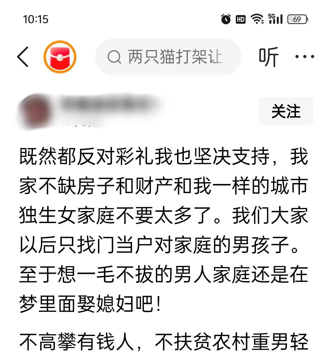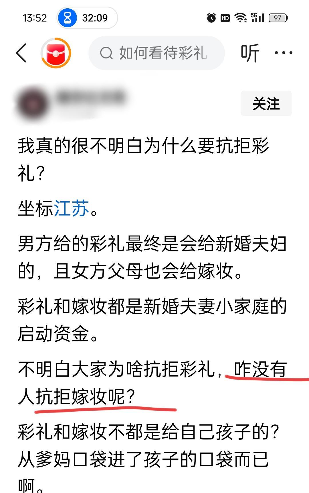 每个女人结婚都有嫁妆吗? 有些作者就是装糊涂 是的,城市里,彩礼会带回去,并且会有嫁妆 但是,如果这个钱不是小家庭花的,那么,只是女方私有财产又多了一笔而已 更别说,农村家庭,还准备靠女儿结婚挣一笔呢 我不只一次回复那些说彩礼嫁妆都有,男方结婚赚了的人说 你就回复一句,如果彩礼嫁妆没有或者不给小家庭,全家死绝 目前没人敢说