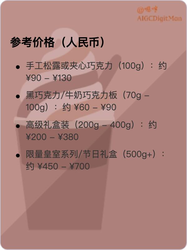 手工松露或夹心巧克力(100g):约 ¥90 - ¥130