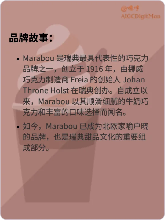 Marabou 是瑞典最具代表性的巧克力品牌之一,创立于 1916 年,由挪威巧克力制造商 Freia 的创始人 Johan Throne Holst 在瑞典创办。