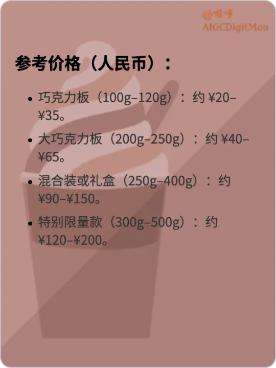 巧克力板(100g–120g):约 ¥20–¥35。