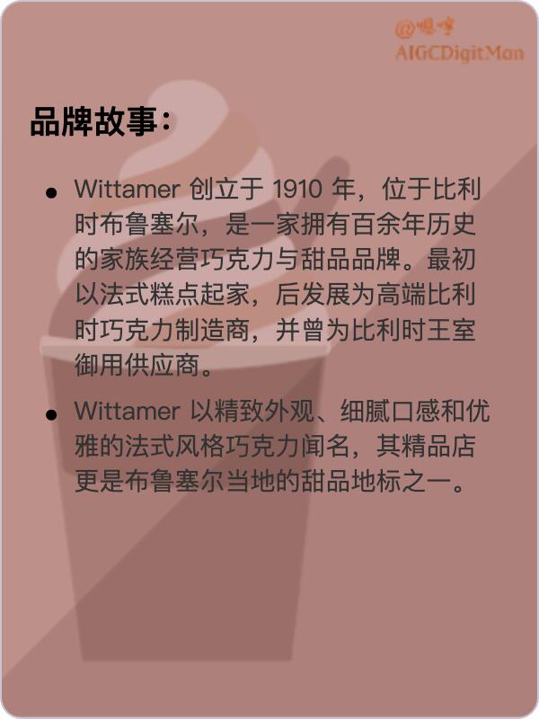 Wittamer 创立于 1910 年,位于比利时布鲁塞尔,是一家拥有百余年历史的家族经营巧克力与甜品品牌。