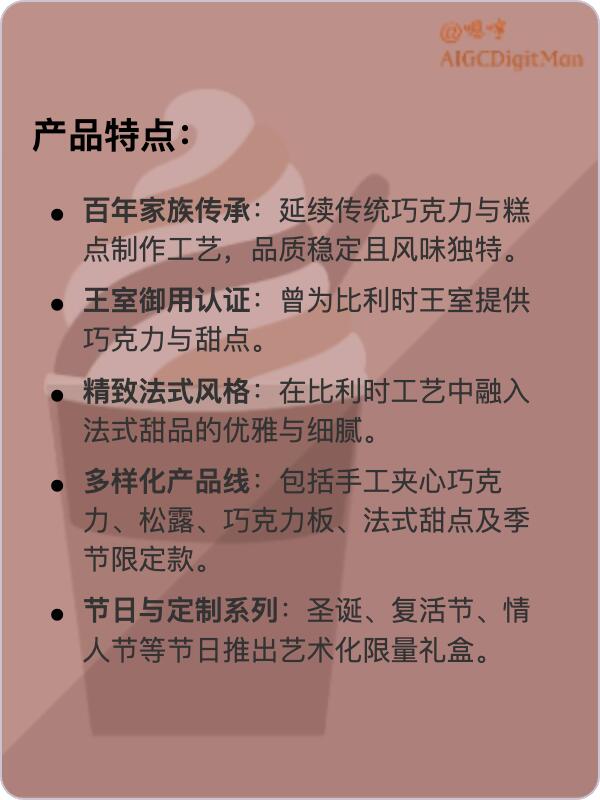 最初以法式糕点起家,后发展为高端比利时巧克力制造商,并曾为比利时王室御用供应商。