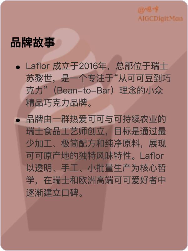 Laflor 以透明、手工、小批量生产为核心哲学,在瑞士和欧洲高端可可爱好者中逐渐建立口碑。
