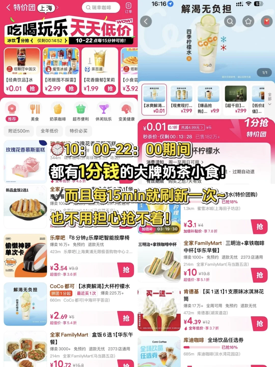 ⏰10:00-22:00整点都有1分钱的大牌奶茶小食~