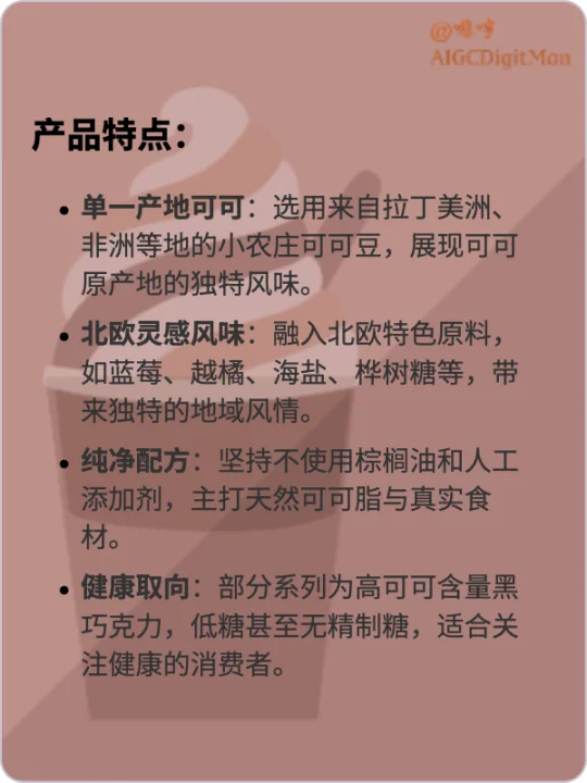 纯净配方:坚持不使用棕榈油和人工添加剂,主打天然可可脂与真实食材。