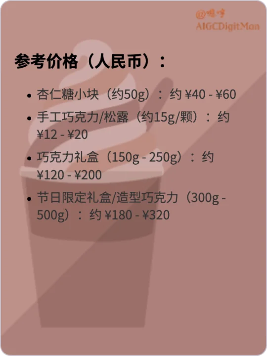 手工巧克力/松露(约15g/颗):约 ¥12 - ¥20