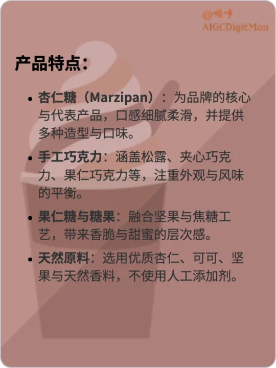 杏仁糖(Marzipan):为品牌的核心与代表产品,口感细腻柔滑,并提供多种造型与口味。