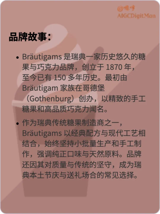 Bräutigams 是瑞典一家历史悠久的糖果与巧克力品牌,创立于 1870 年,至今已有 150 多年历史。