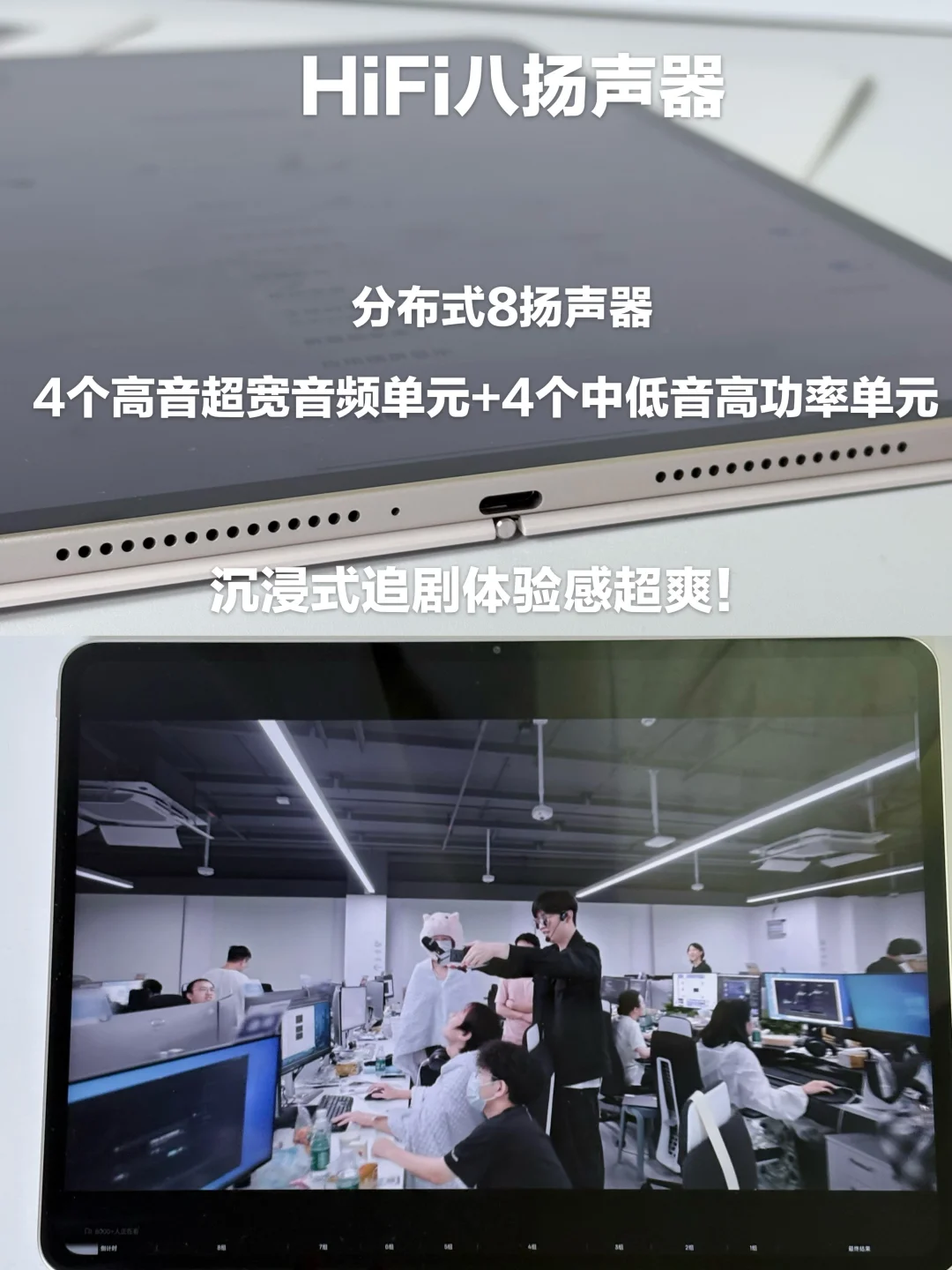 分布式8扬声器 4个高音超宽音频单元+4个中低音高功率单元,上网课/听歌/追剧,声音更开阔