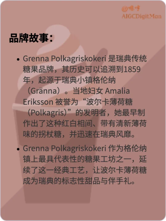 Grenna Polkagriskokeri 是瑞典传统糖果品牌,其历史可以追溯到1859年,起源于瑞典小镇格伦纳(Gränna)。