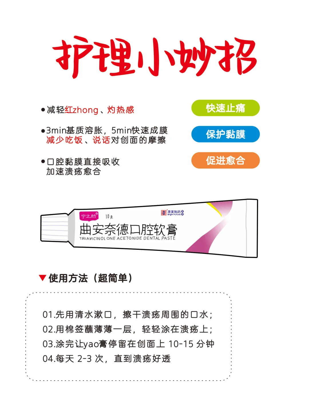 口腔溃疡,这个我可太感同身受了 前一段吃饭看剧,正看到精彩的地方 突然一不小心就咬到了嘴巴上 后面火锅烧烤啥的,碰都不敢碰了 · 其实大多数口腔溃疡长在嘴唇和内侧 但也有的会长在牙龈根、舌尖上 刷牙、吃饭、说话的时候, 一不小心碰到,那滋味,可真的太痛苦了 · 这几类食物千万别碰! 1. 辛辣类食物 2. 刺🐔类饮料 3. 坚硬类食物 4. 过烫 / 酸性食物 · 饮食选择:优先吃温凉、细软的食物,如粥、烂面条、蒸蛋、豆腐等 口腔护.理:用温和的漱口水(或淡盐水)清洁口腔,避免xi菌感染 营养补充:适当吃富含维生素 B、 C 的食物帮助黏.膜.修.复 · 还可以试试曲安奈德口腔软膏 核心成.分曲安奈德,是专门针对口腔溃疡的 “痛点” 发力 ✅ 适合这些情况:​ 复Fa性口腔溃疡(经常长、疼到影响吃饭说话的宝);​ 不小心咬到口腔内侧、烫伤引发的溃疡;​ 之前我长了个大溃疡,疼到喝凉水都嘶哈, 涂了这个第二天就敢吃软面条了! 质地是有点黏的软膏,不刺🐔, 很快会成一层薄膜保护创🩹口 涂完没怪味,揣在包里应急超方便~ 复Fa性溃疡宝子还是要注意少熬夜、别吃太辣!如果溃疡超过 2 周没好,或者一次长好几个,一定要去看口腔科哦~