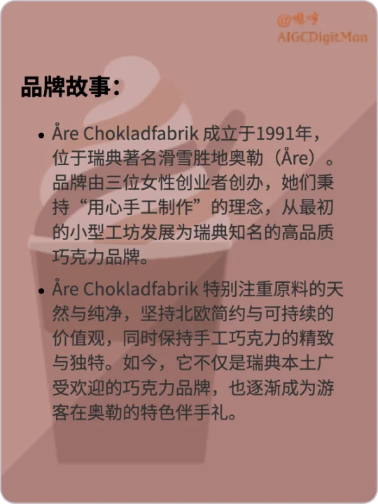 品牌由三位女性创业者创办,她们秉持“用心手工制作”的理念,从最初的小型工坊发展为瑞典知名的高品质巧克力品牌。