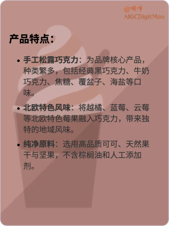 手工松露巧克力:为品牌核心产品,种类繁多,包括经典黑巧克力、牛奶巧克力、焦糖、覆盆子、海盐等口味。