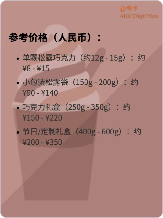 单颗松露巧克力(约12g - 15g):约 ¥8 - ¥15