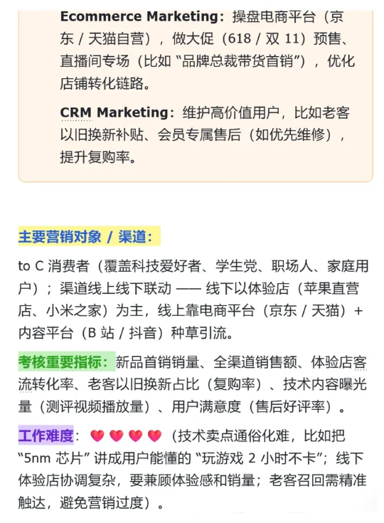 Retail Marketing:管理线下体验店(苹果直营店、小米之家),策划体验活动(比如 “笔记本免费试用 7 天”“耳机降噪现场测试”),设计门店物料(产品参数海报、功能演示牌)。
