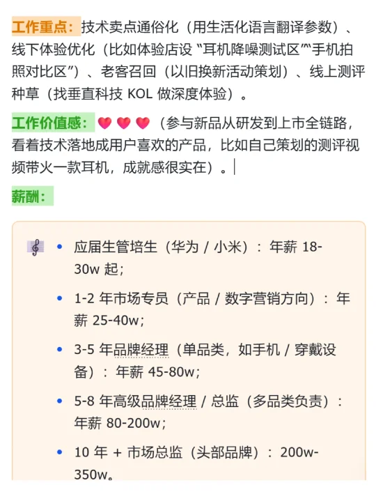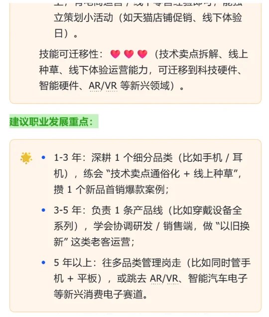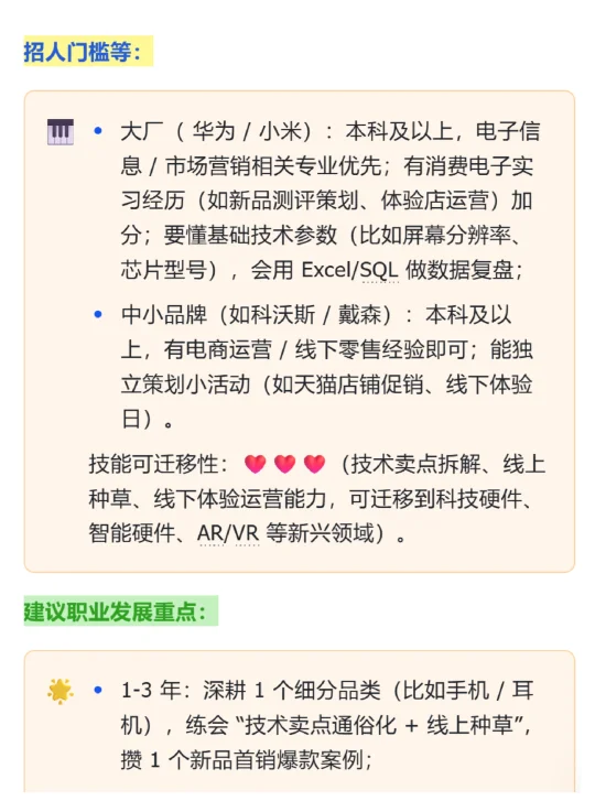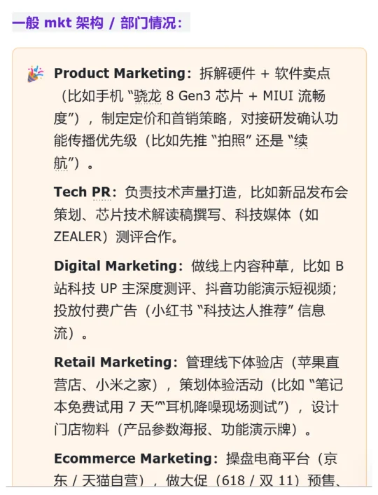 Product Marketing:拆解硬件 + 软件卖点(比如手机 “骁龙 8 Gen3 芯片 + MIUI 流畅度”),制定定价和首销策略,对接研发确认功能传播优先级(比如先推 “拍照” 还是 “续航”)。