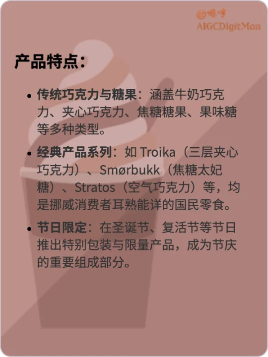 经典产品系列:如 Troika(三层夹心巧克力)、Smørbukk(焦糖太妃糖)、Stratos(空气巧克力)等,均是挪威消费者耳熟能详的国民零食。