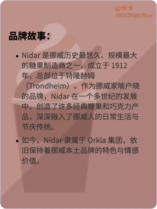 Nidar 是挪威历史最悠久、规模最大的糖果制造商之一,成立于 1912 年,总部位于特隆赫姆(Trondheim)。