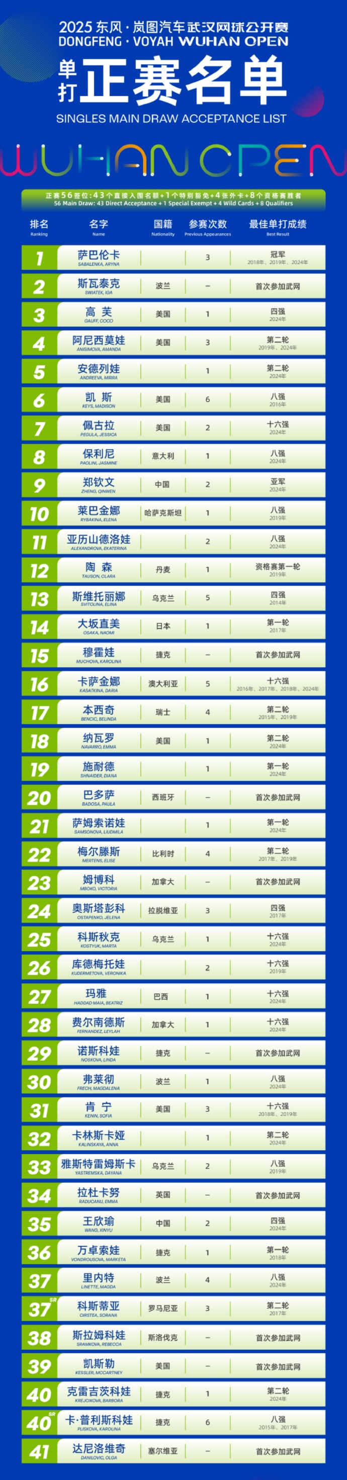 世界第一、三届赛会冠军萨巴伦卡领衔,顶尖选手悉数出战,共计11位大满贯得主、四位新老球后在列。中国选手方面,郑钦文、王欣瑜两位金花直接入围。