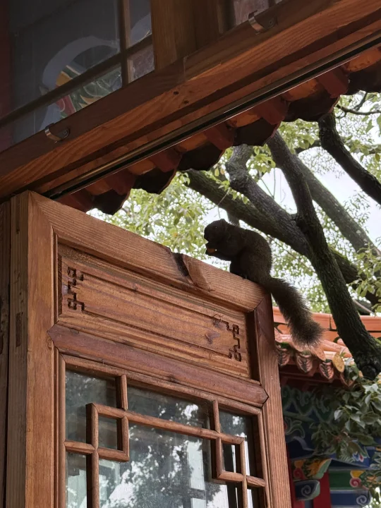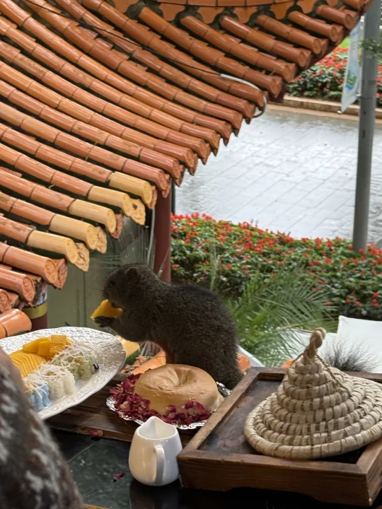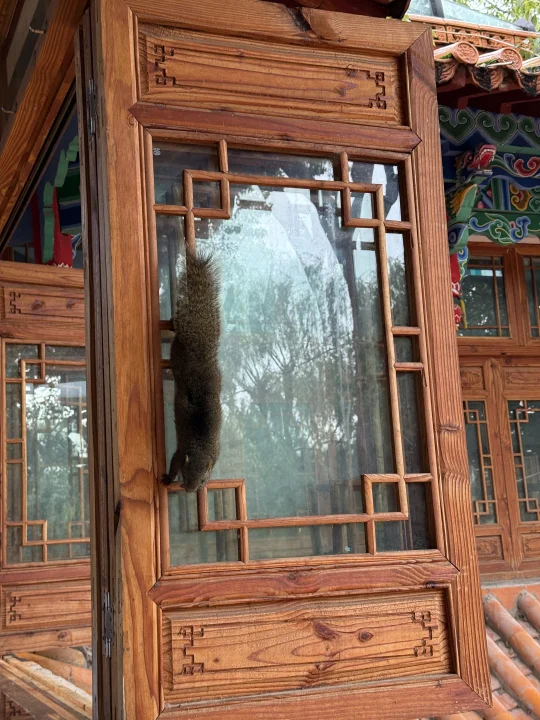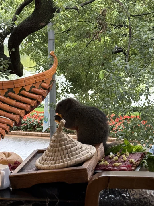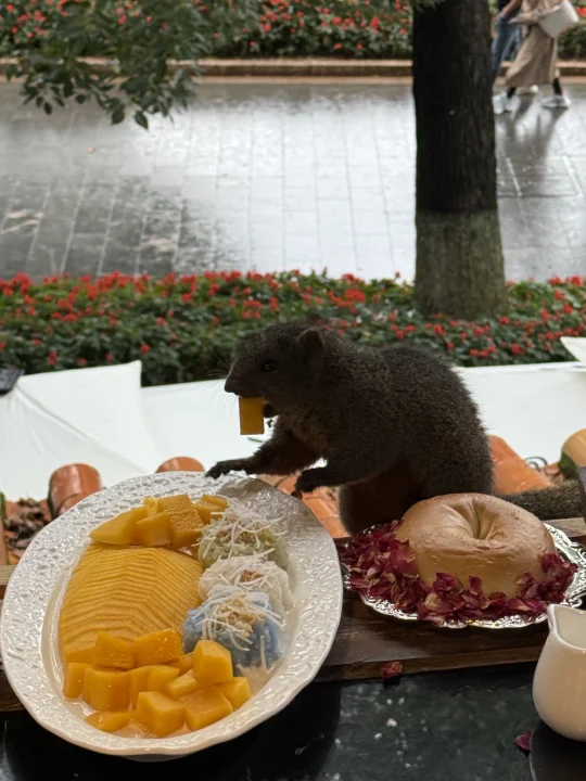 吃饭偶遇小松鼠来偷吃! 叼起来一块芒果就塞进嘴里! 仰头吃、爬窗吃、吃完就走~太可爱噜