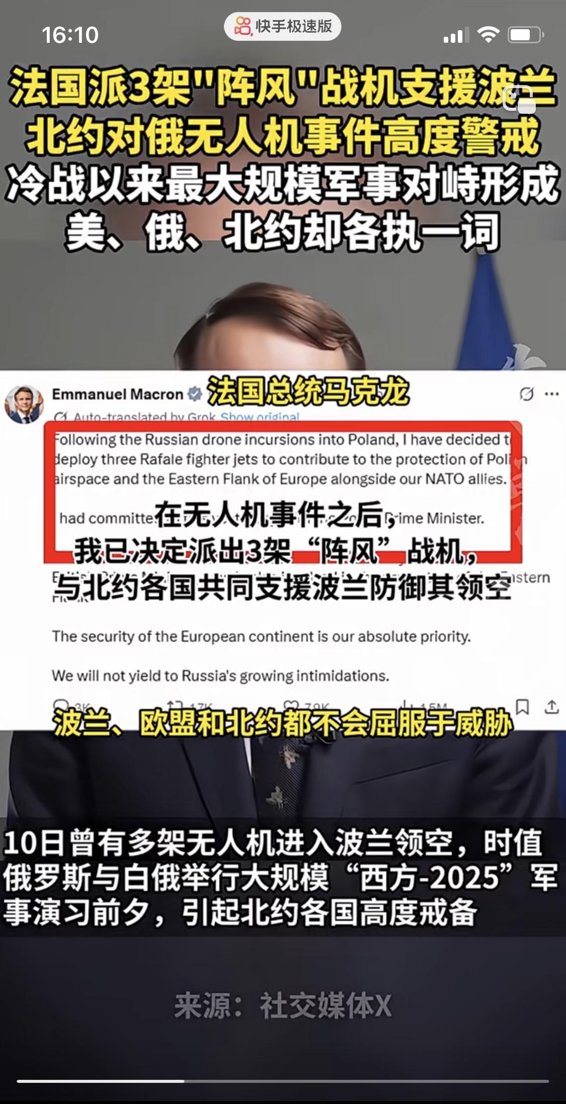 克宫暂停俄乌谈判了, 特朗普的耐心又快消耗光了, 唯独泽连斯基高兴了。 因为不知哪来的无人机,北约终于找到在波兰部署军事力量的“合理”理由。丹麦、法国和德国已率先采取行动,部署多架军机(丹麦派遣2架F-16战斗机、法国部署3架“阵风”战斗机、德国部署4架欧洲“台风”战斗机以加强北约东翼的军事力量。另外,丹麦还派出1艘军舰支援波兰,其它的北约国家也将随后加入! 俄乌冲突战火从特普会后的停火希望就这么突然转变成了大有外溢之势……