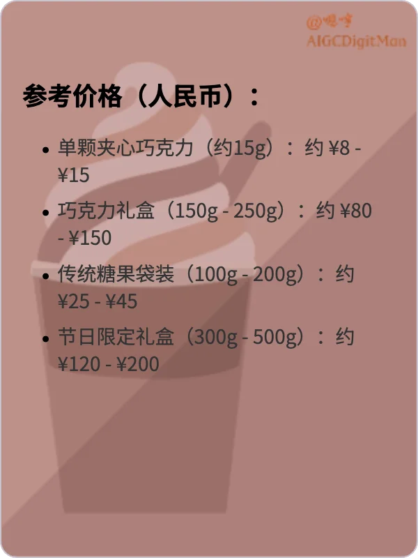 巧克力礼盒(150g - 250g):约 ¥80 - ¥150