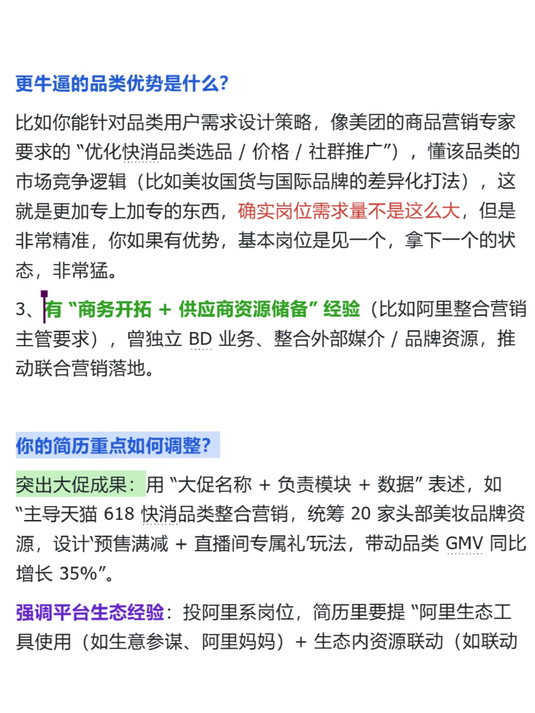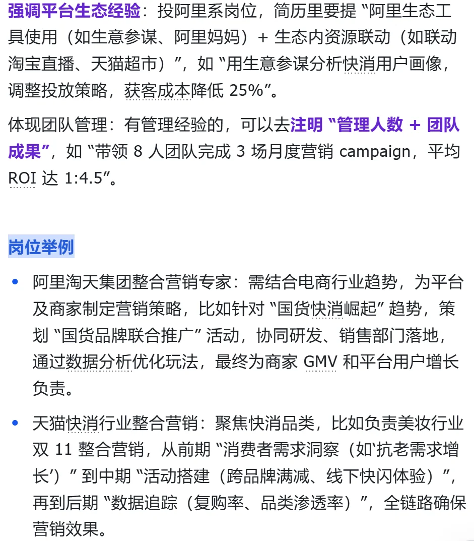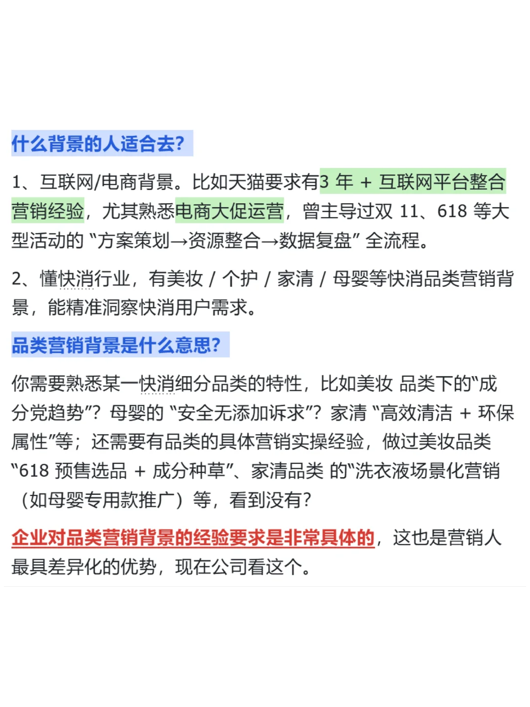 1、互联网/电商背景。比如天猫要求有3 年 + 互联网平台整合营销经验,尤其熟悉电商大促运营,曾主导过双 11、618 等大型活动的 “方案策划→资源整合→数据复盘” 全流程。