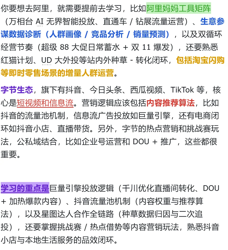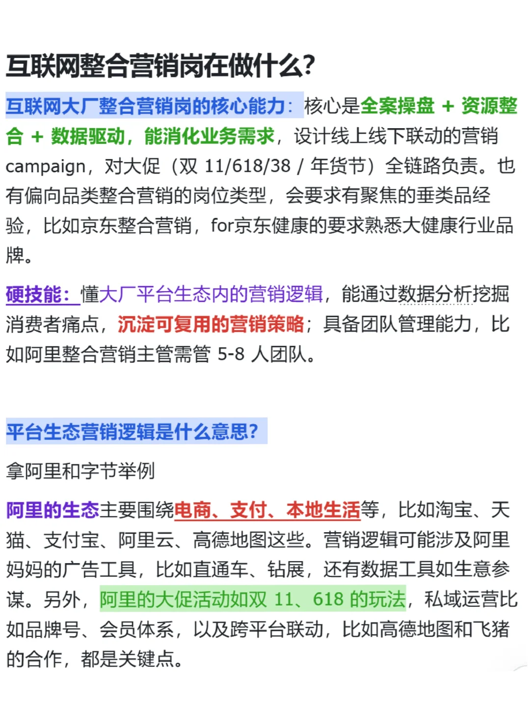 ✅硬技能:懂大厂平台生态内的营销逻辑,能通过数据分析挖掘消费者痛点,沉淀可复用的营销策略;具备团队管理能力,比如阿里整合营销主管需管 5-8 人团队。