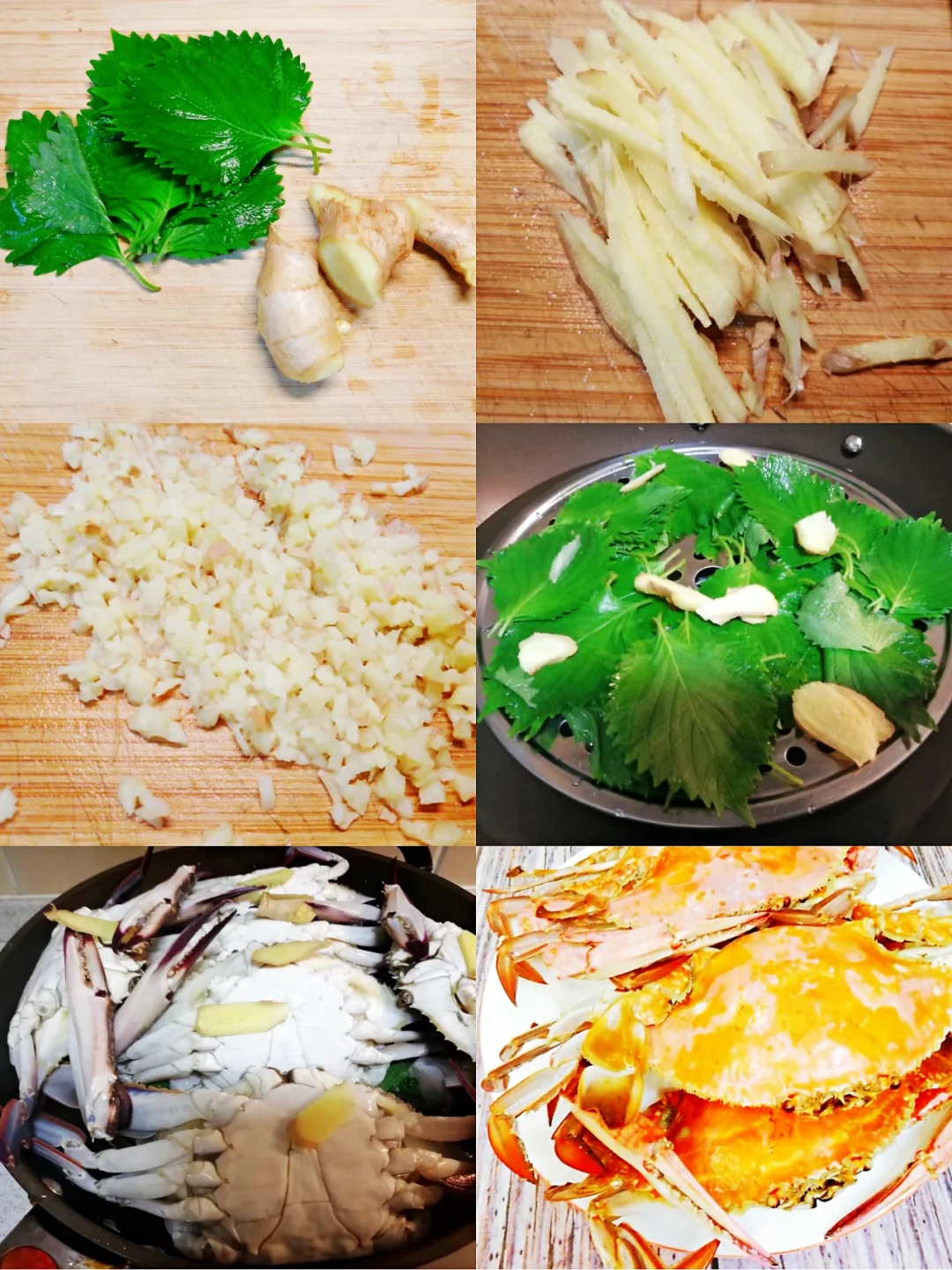 (一) 准备食材:舟山梭子蟹6只约3斤左右,生姜3块,紫苏叶20克。