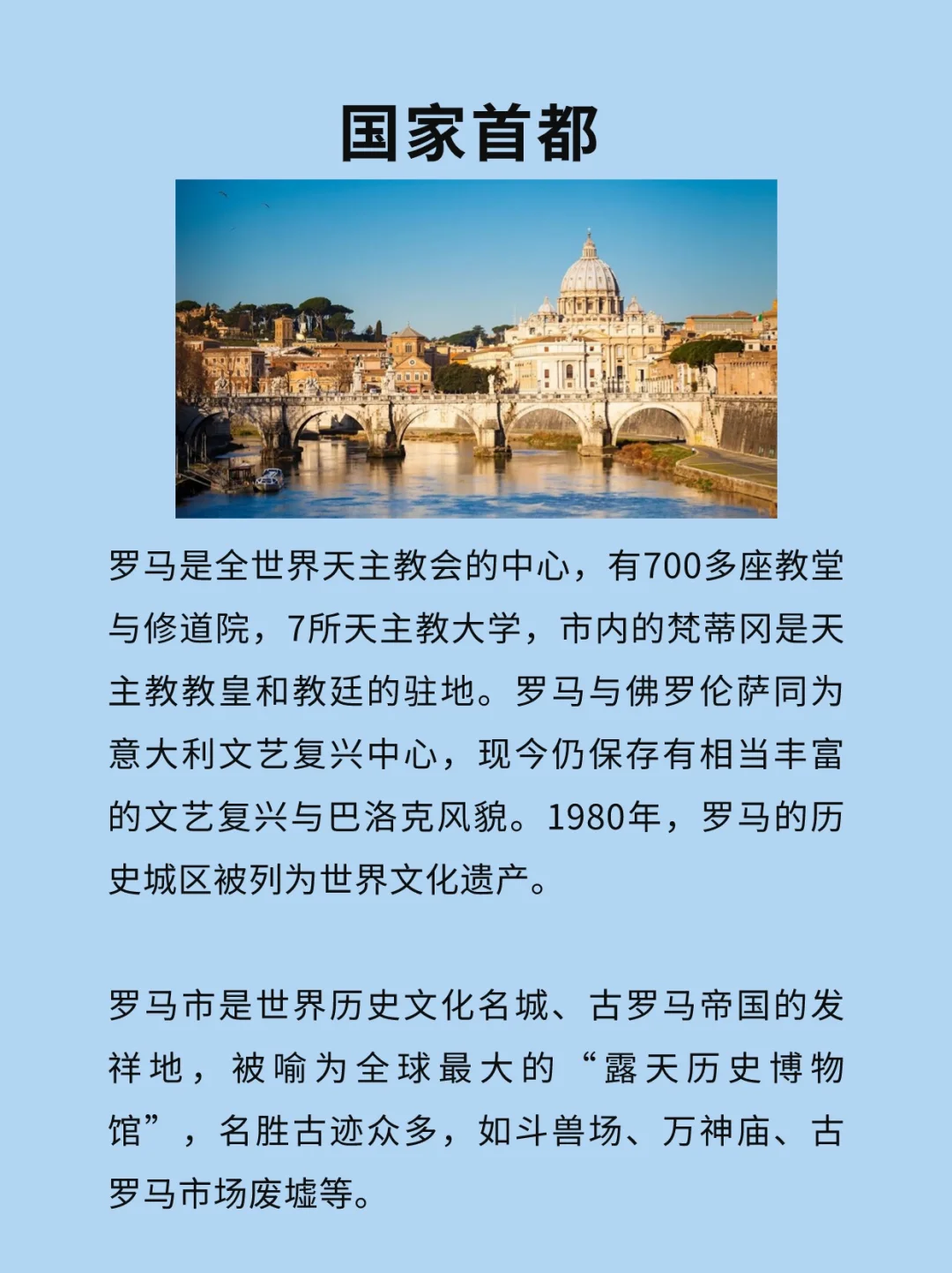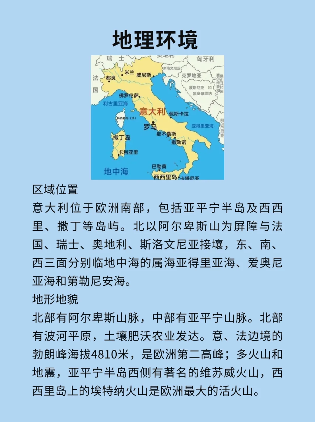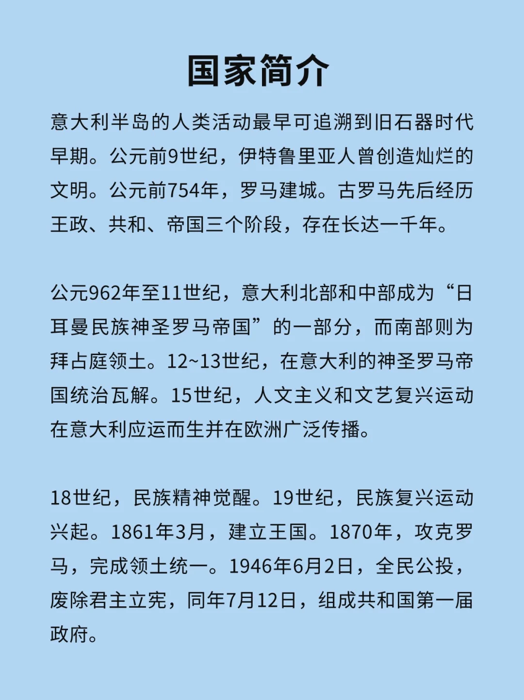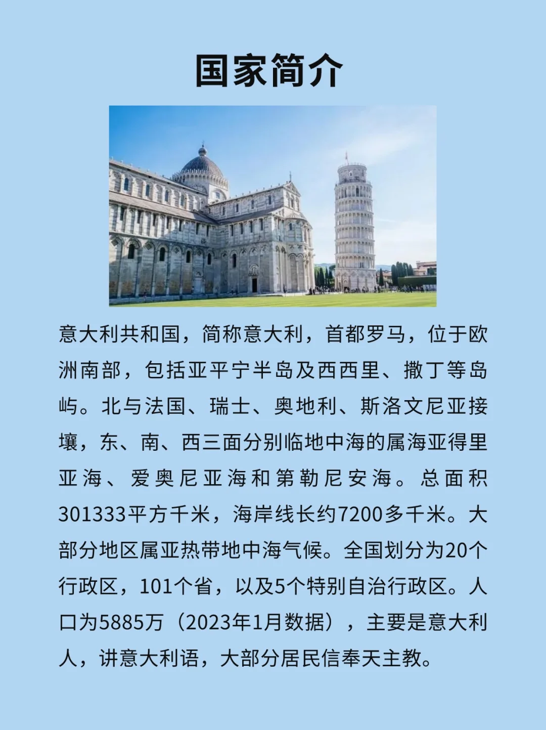 [打卡R]意大利共和国,简称意大利,首都罗马,位于欧洲南部,包括亚平宁半岛及西西里、撒丁等岛屿。北与法国、瑞士、奥地利、斯洛文尼亚接壤,东、南、西三面分别临地中海的属海亚得里亚海、爱奥尼亚海和第勒尼安海。总面积301333平方千米,海岸线长约7200多千米。 [彩虹R]大部分地区属亚热带地中海气候。全国划分为20个行政区,101个省,以及5个特别自治行政区。人口为5885万(2023年1月数据),主要是意大利人,讲意大利语,大部分居民信奉天主教。