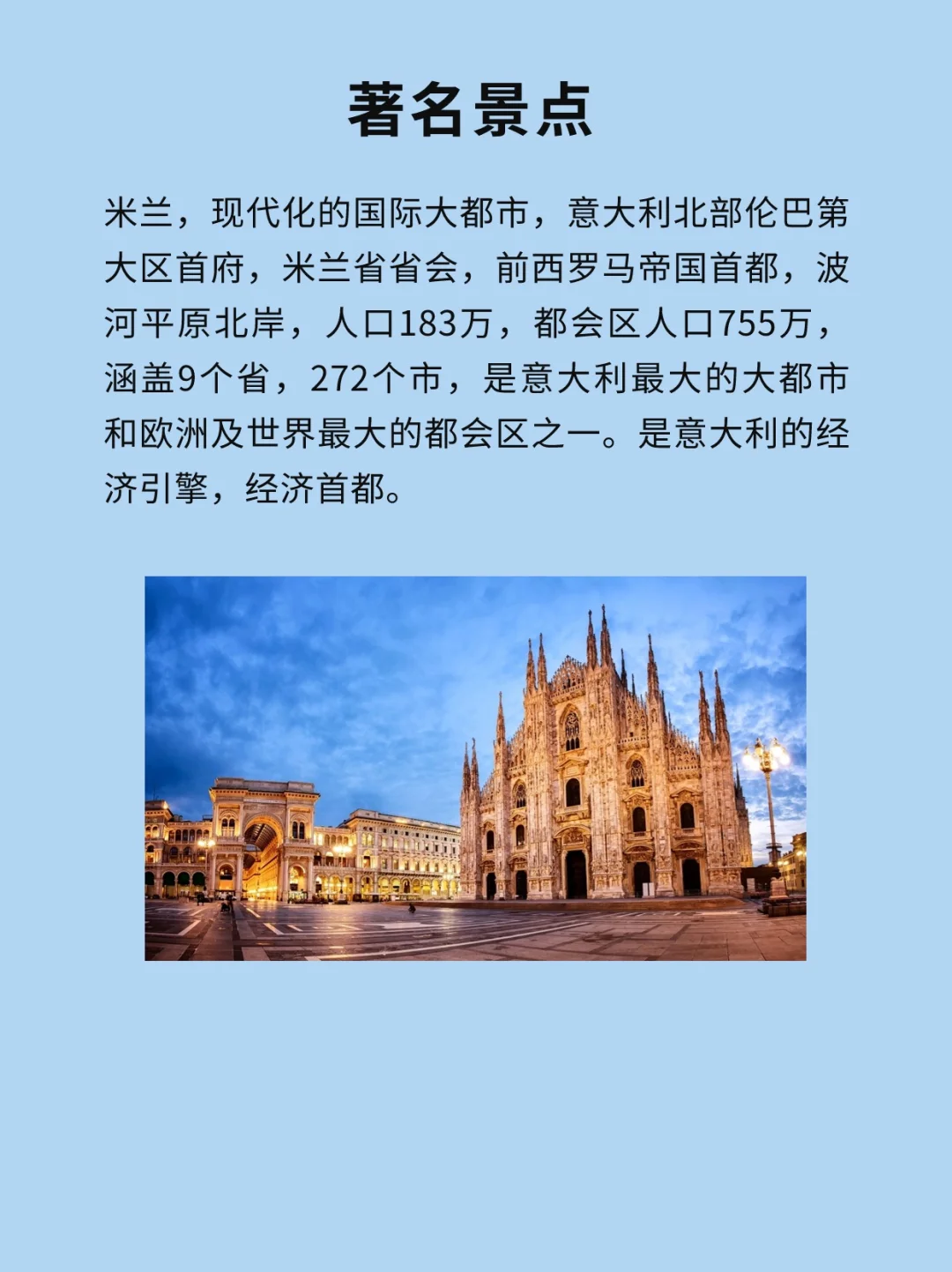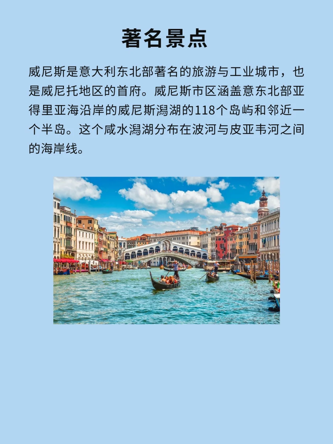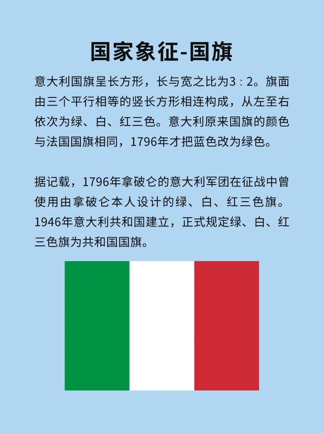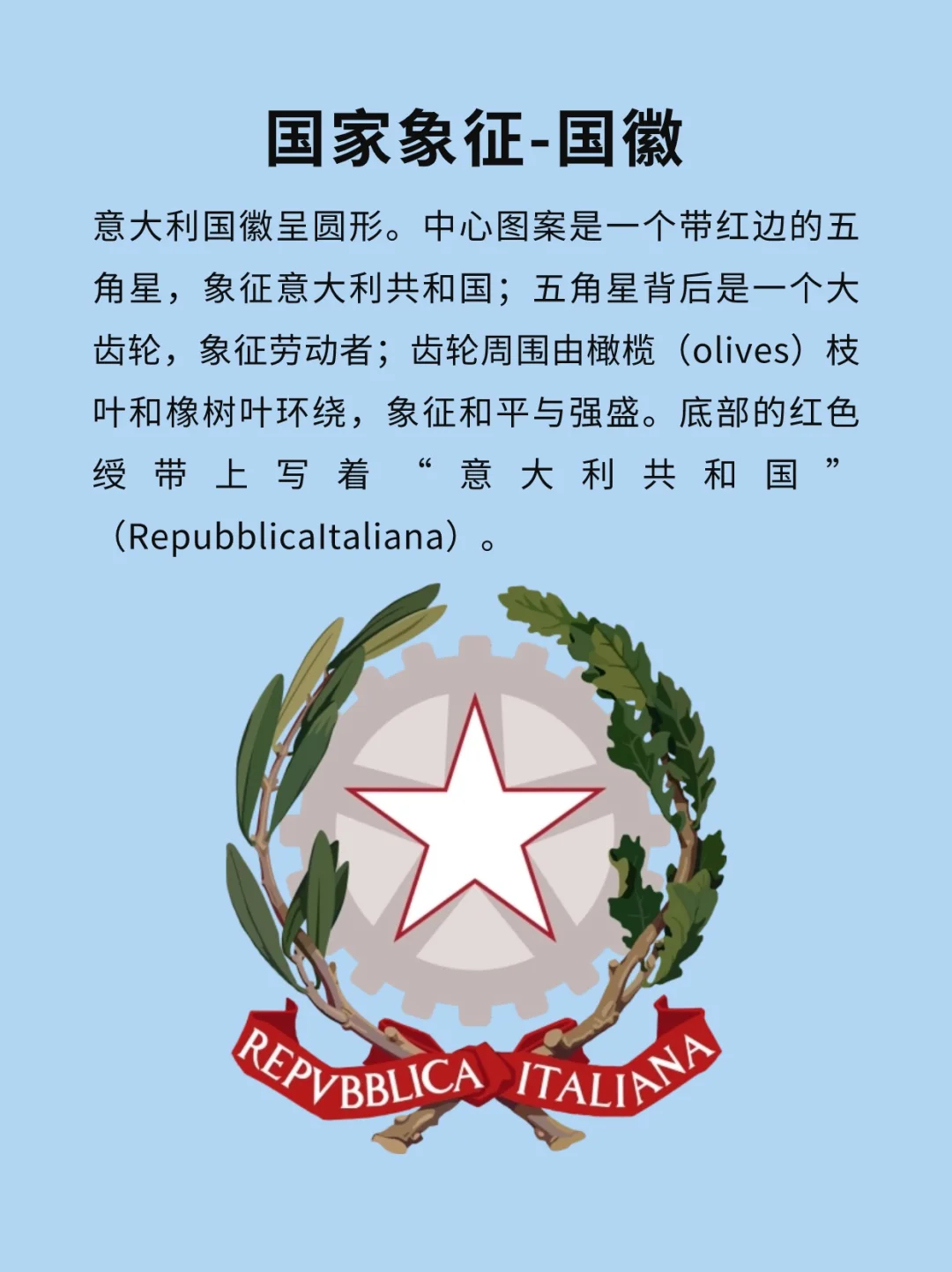 [打卡R]意大利共和国,简称意大利,首都罗马,位于欧洲南部,包括亚平宁半岛及西西里、撒丁等岛屿。北与法国、瑞士、奥地利、斯洛文尼亚接壤,东、南、西三面分别临地中海的属海亚得里亚海、爱奥尼亚海和第勒尼安海。总面积301333平方千米,海岸线长约7200多千米。 [彩虹R]大部分地区属亚热带地中海气候。全国划分为20个行政区,101个省,以及5个特别自治行政区。人口为5885万(2023年1月数据),主要是意大利人,讲意大利语,大部分居民信奉天主教。