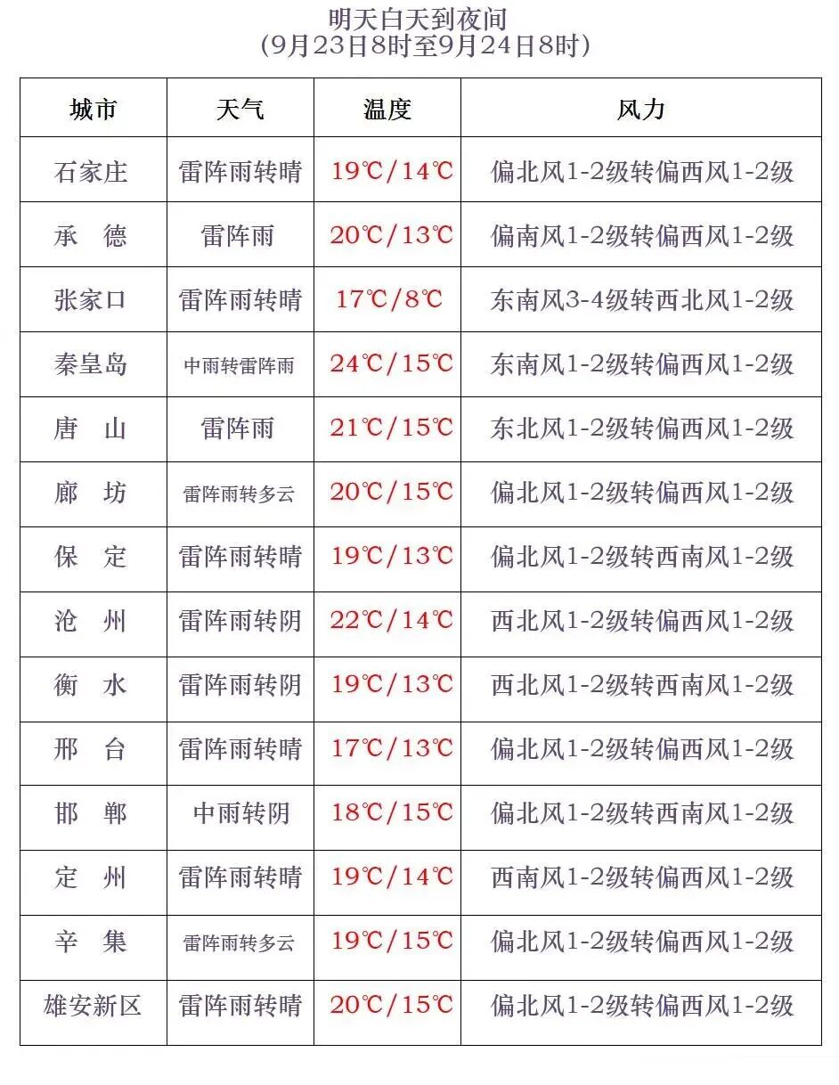 明天白天,唐山中东部、秦皇岛、沧州东部、衡水东部、邢台东部、邯郸中东部多云转阴有中雨,其他地区阴有小雨。