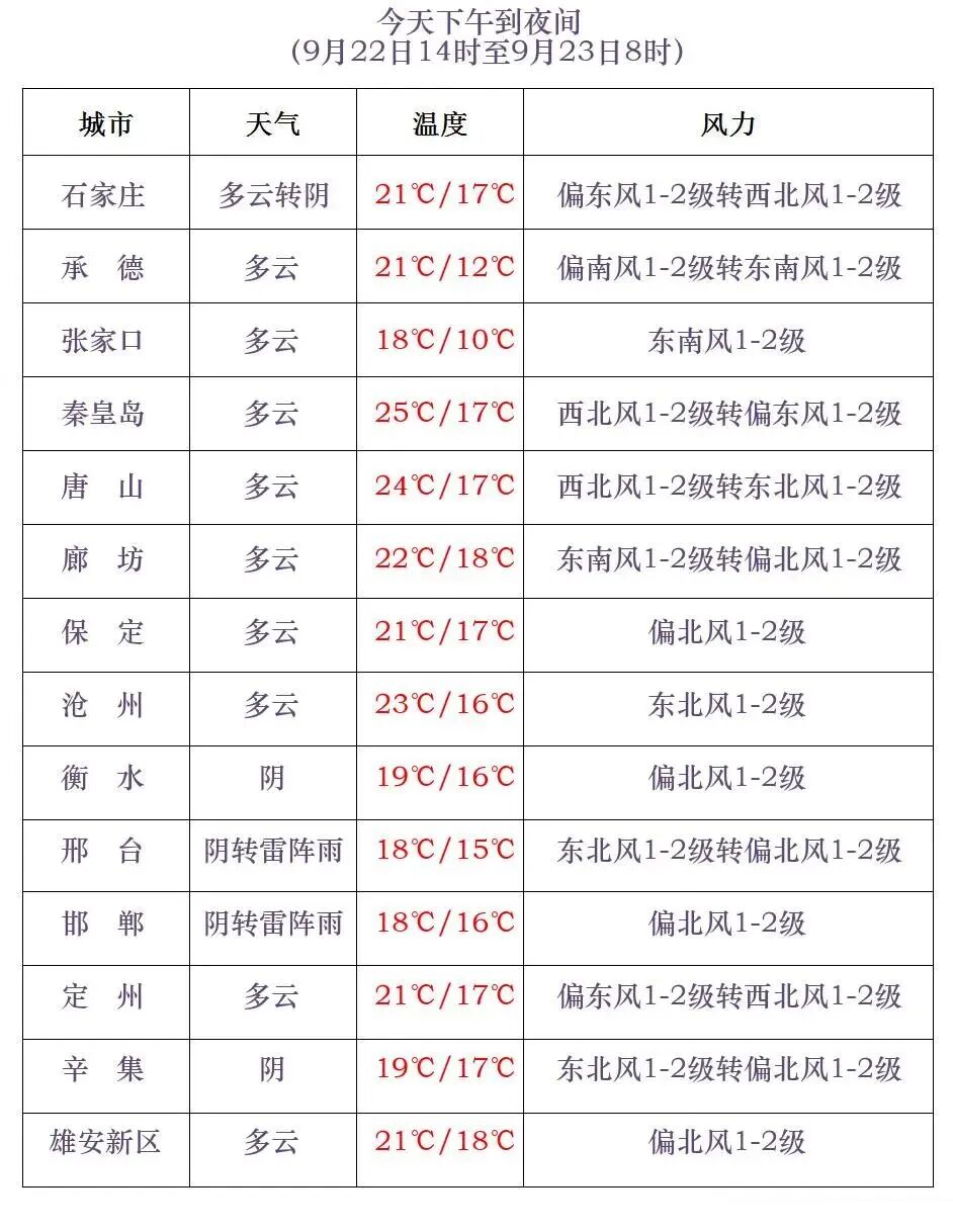 今天下午到夜间,邢台、邯郸多云转阴有小雨或零星小雨,其他地区多云。