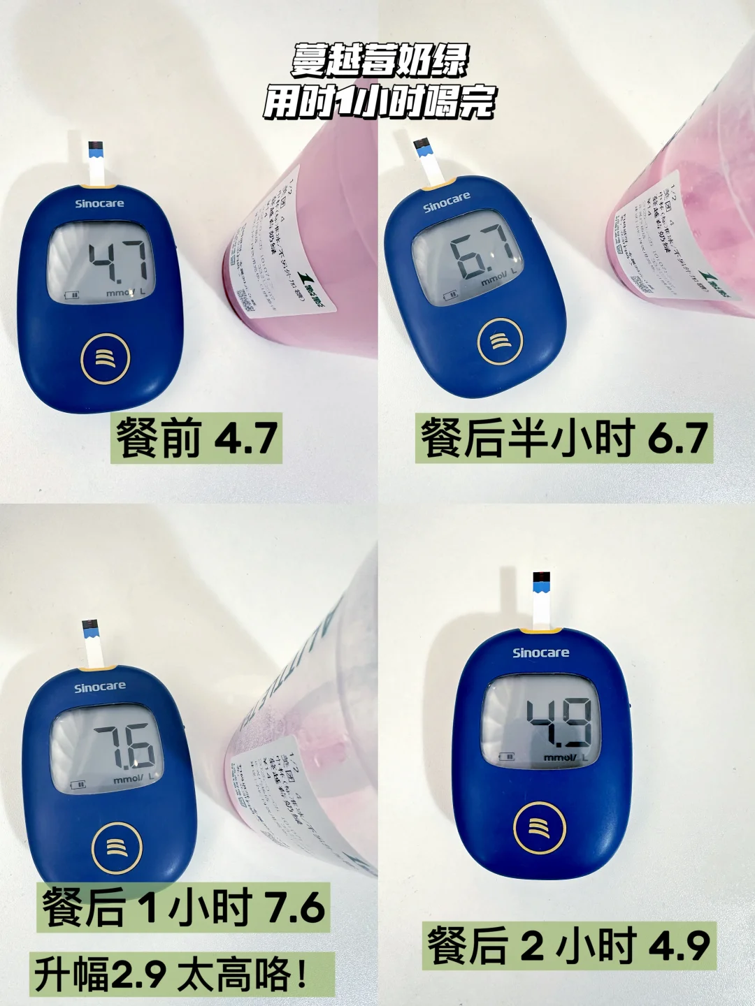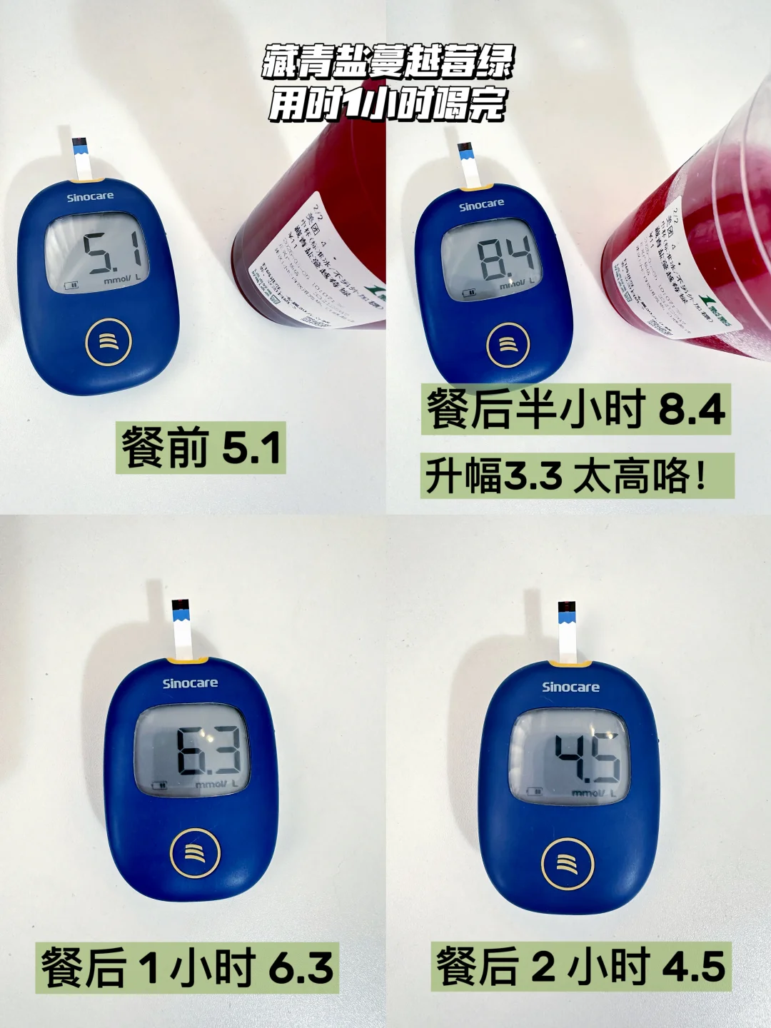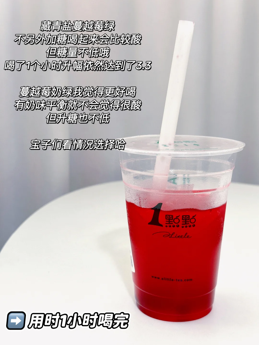 藏青盐蔓越莓绿,不另外加糖喝起来会比较酸,但糖量不低哦,喝了1个小时升幅依然达到了3.3〰️