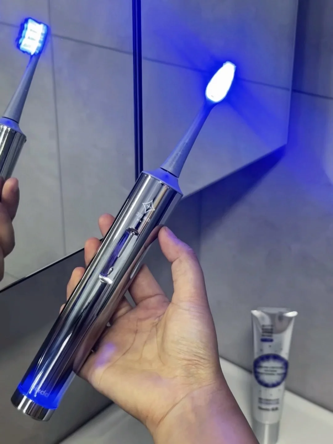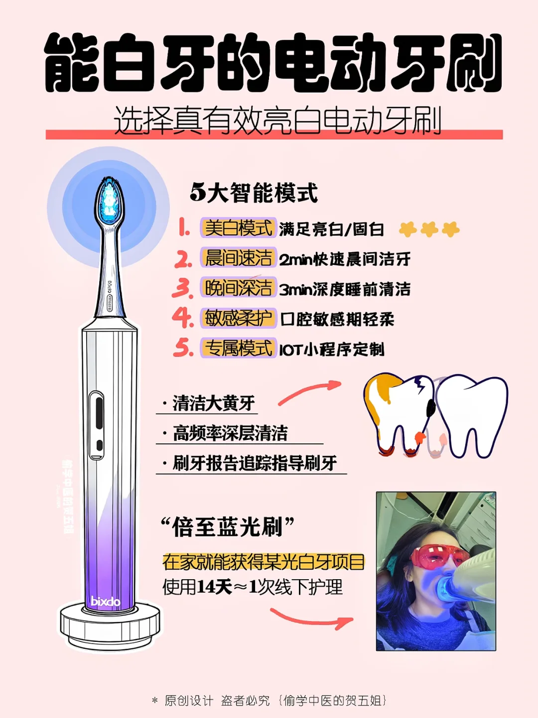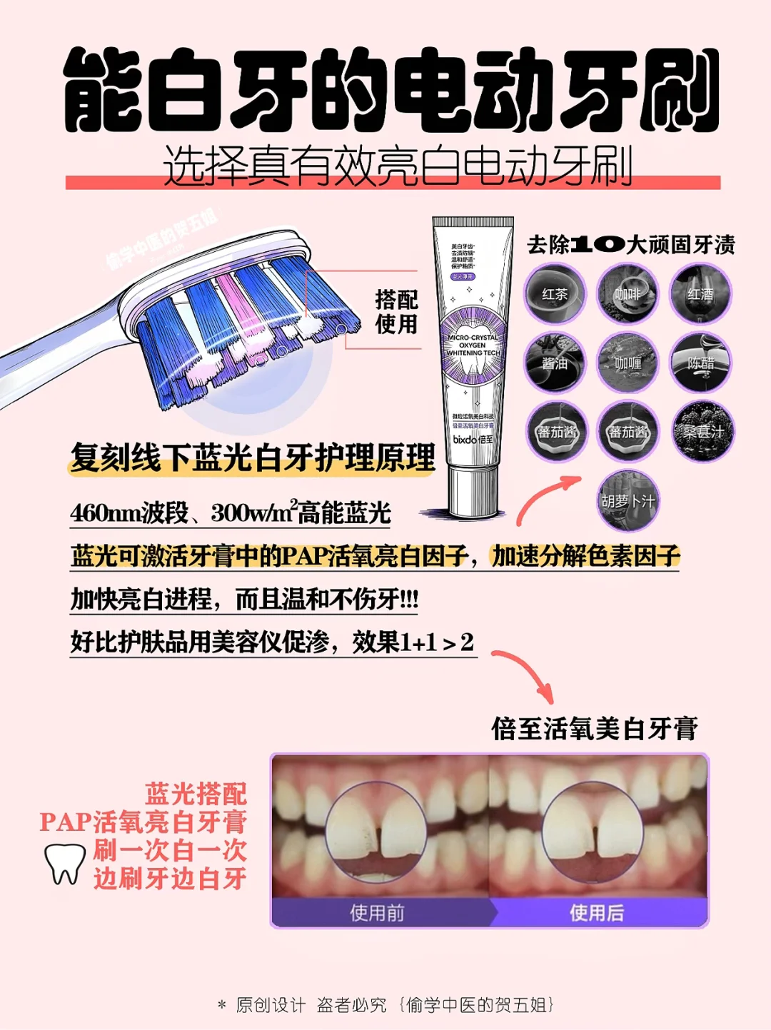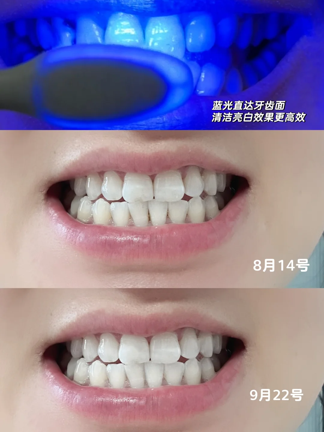 它采用线下同源的蓝光亮白牙齿技术,刷头导入460nm波段+300w/m²的高能蓝光,搭配倍至PAP活氧亮白牙膏使用,用蓝光激活牙膏中的PAP亮白因子,比只用牙膏有效得多,能从外到内瓦解牙齿咖啡、🚬等顽固牙渍,让牙齿重现健康白,我大概用了两周就看到了牙齿有明显变白!!!