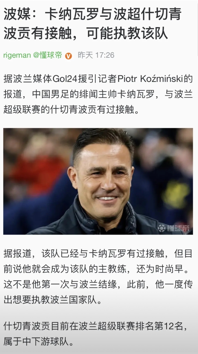 卡纳瓦罗这是在坐地起价? 自从中国队官方发布通告招募主教练,卡纳瓦罗是第一个被传出明确投递了简历的主教练,参考他在欧洲的执教经历,他显然更渴望回到中国,这里是他发迹的福地。 但谁也没想到又传出来卡纳瓦罗拒绝中国的消息,如今又明确传出来是一支波兰的俱乐部。 结合这个事件前后发展,有理由相信这是卡纳瓦罗在坐地起价呢,要我说,这是真不知道好歹,他自己早就不吃香了,跟他同期的齐达内早就成了世界名帅,下一任的法国队主教练,而他自己呢?还是现实一点吧,有个工作就差不多得了。