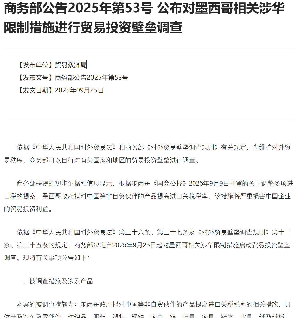 讨好特朗普?墨西哥针对对中国征税,中方先发制人宣布发起调查 墨西哥突然下狠手,对中国高达1400类商品加征关税,汽车税率能飙到50%,唯独美国货不在限令里,摆明了是给特朗普送投名状。 消息一出来,中国商务部第一时间宣布对墨西哥贸易投资壁垒展开调查,直接亮明了态度。 两国这一来一回,背后藏着大国博弈的暗流,单边保护主义和多边贸易规则正面碰撞,全球供应链的走向又蒙上一层迷雾。 墨西哥最近的举动,怎么看都带点投机心理。表面上说是经济调整,实际上更像是政治操作。 新总统谢恩鲍姆刚上任,面对美国压力山大,尤其是特朗普一回锅,关税大棒挥得更狠,美墨加协定(USMCA)能不能保住还两说。 墨西哥这波对华加税,汽车、钢铁、化工全都覆盖,税率10%到50%不等,偏偏美国人卖什么都能豁免,想装没站队都难。金融圈普遍认为,墨西哥这是用“对华强硬”来换美国的投资和关税特权,企图两头讨好。 但问题来了,中墨之间可不是单纯的买卖关系。光2023年,双方贸易额就干到1100亿美元,汽车零部件、电子元件、机械设备,墨西哥的工厂随便一查,十有八九都离不开中国货。 全球产业链早就你中有我,断谁的供应链都像是自断一臂。墨西哥政府这波操作,表面上是给特朗普送面子,背地里却在考验自己制造业的抗打击能力。 说白了,墨西哥想端美国的饭碗,靠限制中国真的能如愿?国际惯例早就有过类似剧本,巴西、印度当年对华加税,结果要么企业喊疼,要么本国消费者买单,最后都得自己找台阶下来。 中国这次的反应,出手速度堪比闪电,和过去的“被动挨打”完全不同。贸易战打到现在,谁都明白,光靠讲道理没用,得有真本事才能让人收敛。 中方商务部官宣,坚决维护自身权益,这句话说得不重不轻,但分量十足。 以前遇到贸易摩擦,大多等着对方政策落地再反制,这次直接提前调查,信号释放得非常清楚:你要是敢搞歧视性措施,那就别怪我不客气。 环球时报也不客气,直言中国底线很清楚,不能允许别人拿中国利益当交换筹码。只要墨西哥敢带头,欧盟、东盟没准也跟风,到时候吃亏的还不是全球产业链? 这场主动出击,不只是保护比亚迪、华为这些中国出口大户,更是想打消各国“牺牲中国换美国好处”的幻想。 贸易摩擦不是新鲜事,但打得好不好、谁先出招,影响可不光在中墨之间。就像下棋一样,谁让子快,谁就掌握主动权。中国这次提前亮剑,既是给墨西哥看,也是给其他蠢蠢欲动的经济体敲警钟。 再把镜头拉远点,这场风波其实只是中美墨三角关系的缩影。特朗普一上台,对中国的关税威胁就没断过,电动车、光伏产品、芯片都被点名。 美国手里的贸易工具箱,翻来覆去就那几招,每次还都拉上“邻居”一起下场。 墨西哥的位置太微妙,夹在中美之间,既想吃中国的供应链红利,又不敢得罪美国老大。现在的墨西哥,有点像当年越南、印度,被美国推着“修理”中国,背后其实是大国在隔空较量。 如果墨西哥真把高关税落地,中国绝不会袖手旁观。打个比方,墨西哥要是敢动真格,中国随时能在WTO告状,还能限制墨西哥牛油果、龙舌兰进中国市场。 经贸关系说到底是双向的,谁都离不开谁。全球供应链本来就够脆弱,贸易壁垒一加剧,新兴经济体可能被迫选边站队。 金融时报那帮专家早就喊话,全球化要是被割裂了,吃亏的不光是中国,美国、墨西哥也得一起买单。 回头看这场风波,墨西哥的投机性关税把小国在大国博弈中的难处暴露得一清二楚。中国这次的主动反制,既是防守也是进攻,把多边贸易规则的底线守住了。 贸易保护主义看起来是个“护身符”,其实更像“双刃剑”,用力过猛谁都受伤。 中国要想稳住局面,光靠自己还不够,还得拉上更多新兴市场国家一起发声,撑起全球化这张大网。面对美国的长期科技和地缘围堵,只有合作和规则能带来真正的共赢。 以邻为壑的操作终究搬起石头砸自己脚,全球贸易这盘大棋,谁都不是局外人。墨西哥的投名状是权宜之计,中国的反制才是长远之策。贸易世界,套路多,唯有讲规则才靠谱。 参考资料:中国对墨西哥发起贸易调查,“警告其不得屈服美国压力” 2025-09-27 09:13·观察者网