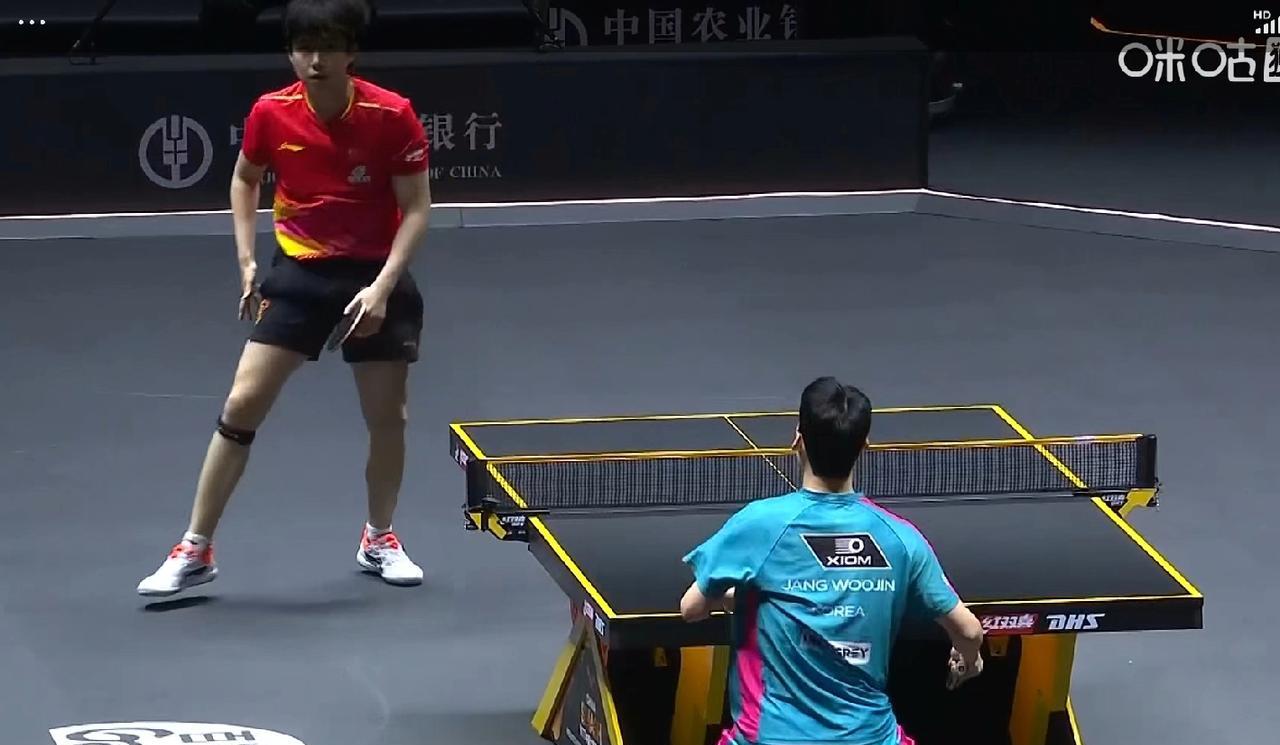 两周之后再次交过, 这是中国大满贯男单1/32决赛。 两周之前,两人在澳门冠军赛半决赛刚刚交过手,当时王楚钦4-0完胜。 今天张禹珍肯定会要搏杀,相信王楚钦不会让你得逞的,限制住张禹珍的正手,让你发挥不出来。 果然是这样王楚钦11-2快速拿下第一局。 志强、牛牛和国乒队员在看台上观赛,为头哥鼓掌。 评论区一起观赛,一起为头哥加油!